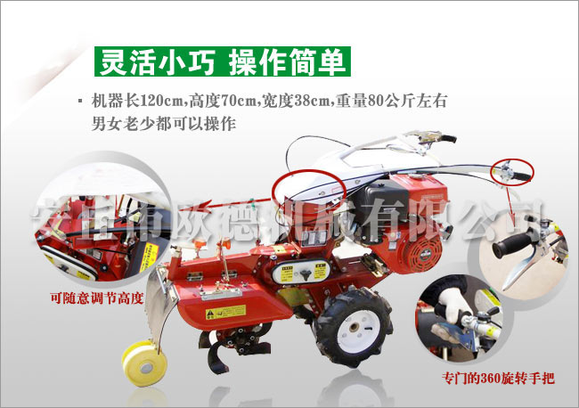 11、適用性強:適用各種山地,丘陵、平原、旱田、水田、大棚、果園、及狹窄地作業(yè),省心。