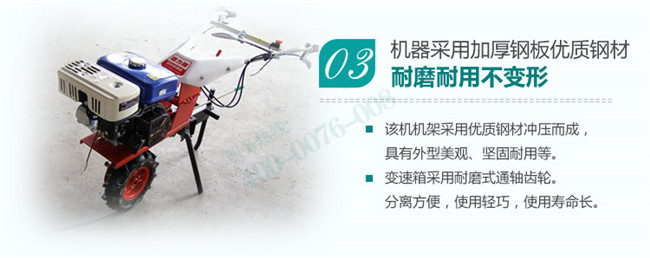6.簡單合理的支稱,在使用單行播種,施肥,單鏵耘地時(shí),支稱下放,整機(jī)能夠水平放置。方便添加種子,化肥。實(shí)現(xiàn)一人操作。