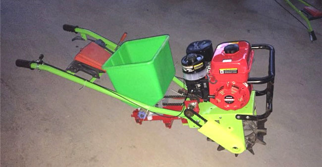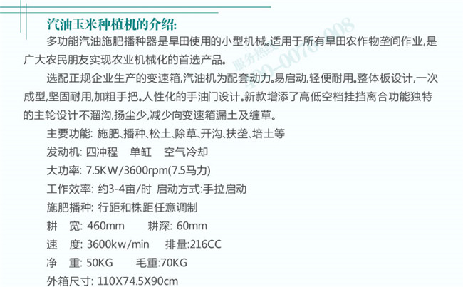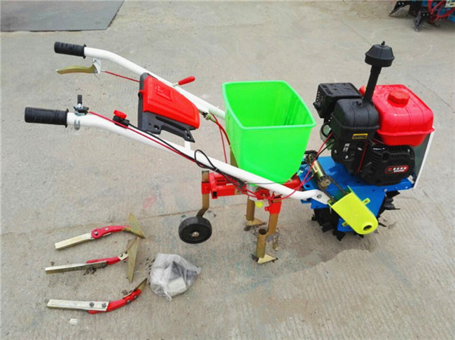 多功能汽油施肥播種器是旱田使用的小型機(jī)械。適用于所有旱田農(nóng)作物壟間作業(yè)。是廣大農(nóng)民朋友實(shí)現(xiàn)農(nóng)業(yè)機(jī)械化的首選產(chǎn)品。    選配正規(guī)企業(yè)生產(chǎn)的變速箱,汽油機(jī)為配套動(dòng)力。易啟動(dòng),輕便耐用。整體板設(shè)計(jì),一次成型,堅(jiān)固耐用。加粗手把。人性化的.手油門設(shè)計(jì)。新款增添了高低空檔掛擋離合功能獨(dú)特的主輪設(shè)計(jì)不溜溝,揚(yáng)塵少,減少向變速箱漏土及纏草。主要功能:施肥;播種;松土;除草;開溝;扶壟;培土等