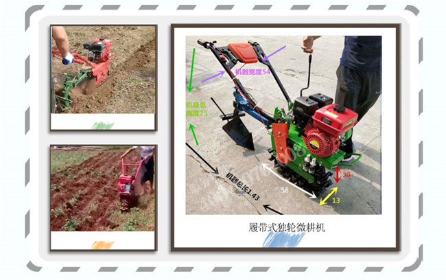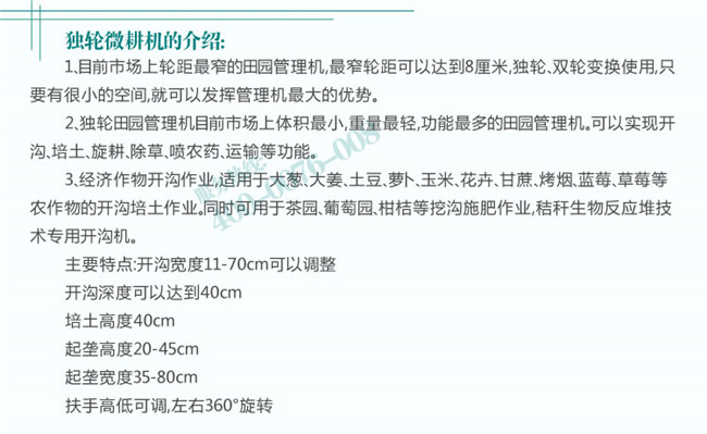 1、獨(dú)輪田園管理機(jī)目前市場上體積最小,重量最輕,功能最多的田園管理機(jī)??梢詫?shí)現(xiàn)開溝、培土、旋耕、除草、噴農(nóng)藥、運(yùn)輸?shù)裙δ堋?br />  2、目前市場上輪距最窄的田園管理機(jī),最窄輪距可以達(dá)到8厘米,獨(dú)輪、雙輪變換使用,只要有很小的空間,就可以發(fā)揮管理機(jī)最大的優(yōu)勢。
